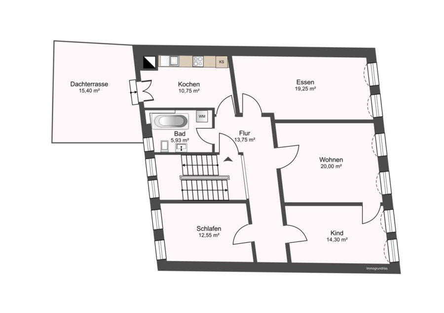 Ein besonderes Highlight ist die sonnige Dachterrasse, die direkt von der Küche aus zugänglich ist. Sie ist zum ruhigen Innenhof ausgerichtet und bietet reichlich Platz für entspannte Stunden im Freien – sei es beim Frühstück in der Morgensonne oder beim gemütlichen Ausklang des Tages.