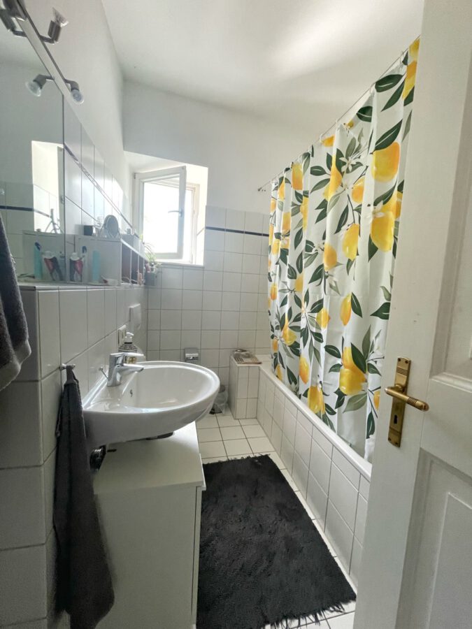 Das weiß geflieste Tageslichtbad ist mit einer Badewanne sowie einem Waschmaschinenanschluss ausgestattet und befindet sich in einem gepflegten Zustand. Die Küche ist praktisch geschnitten und bietet ausreichend Platz zum Kochen und Verstauen.